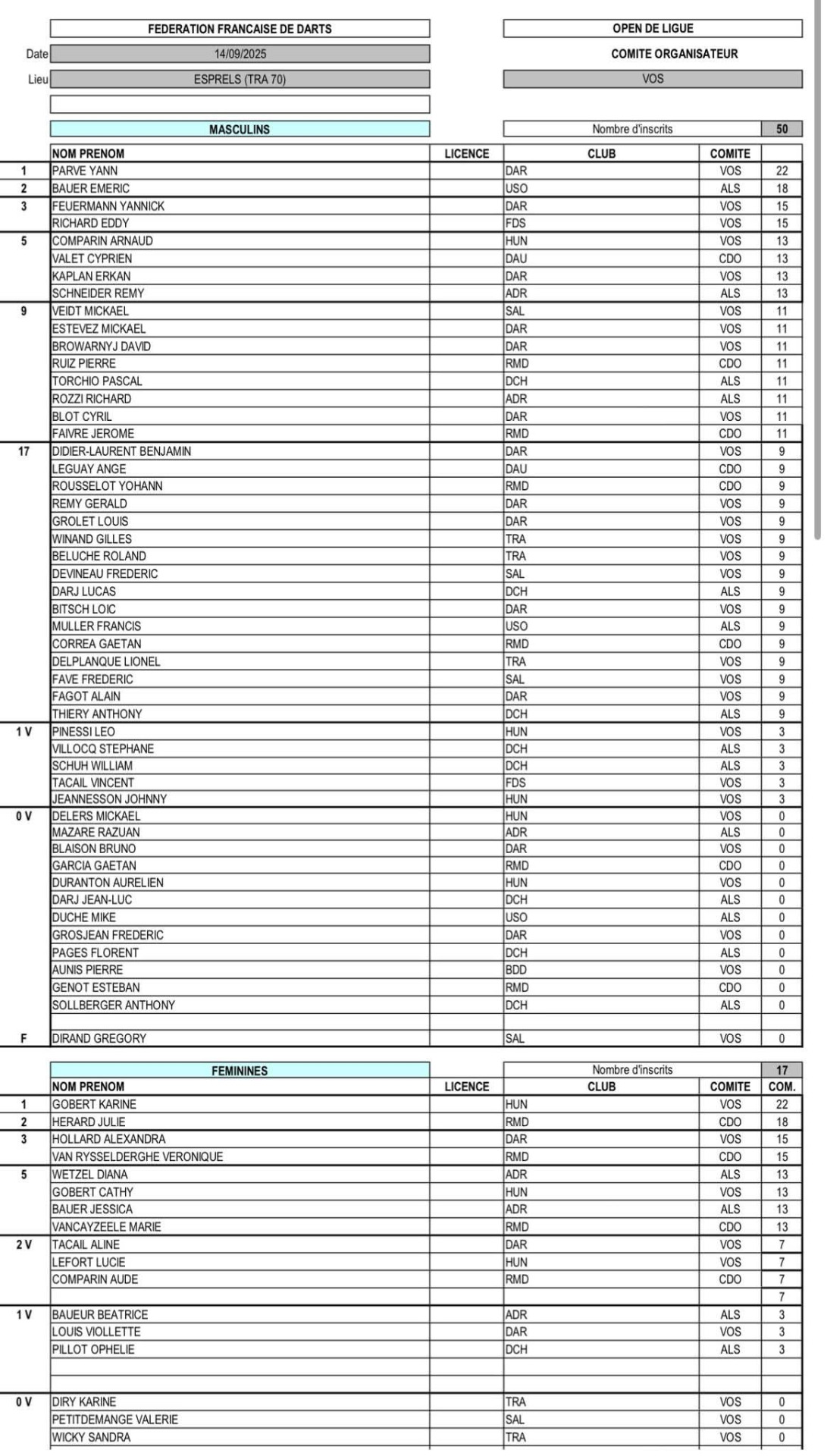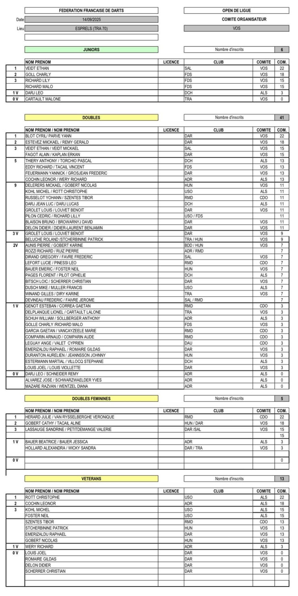 RÉSULTATS TOURNOI DE LIGUE 14-09-2025 ESPRELS