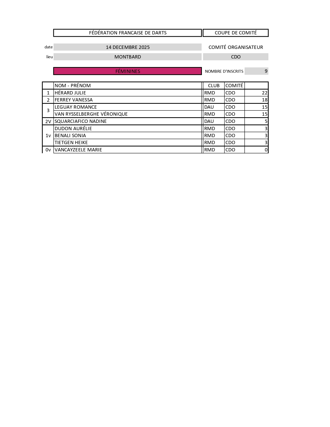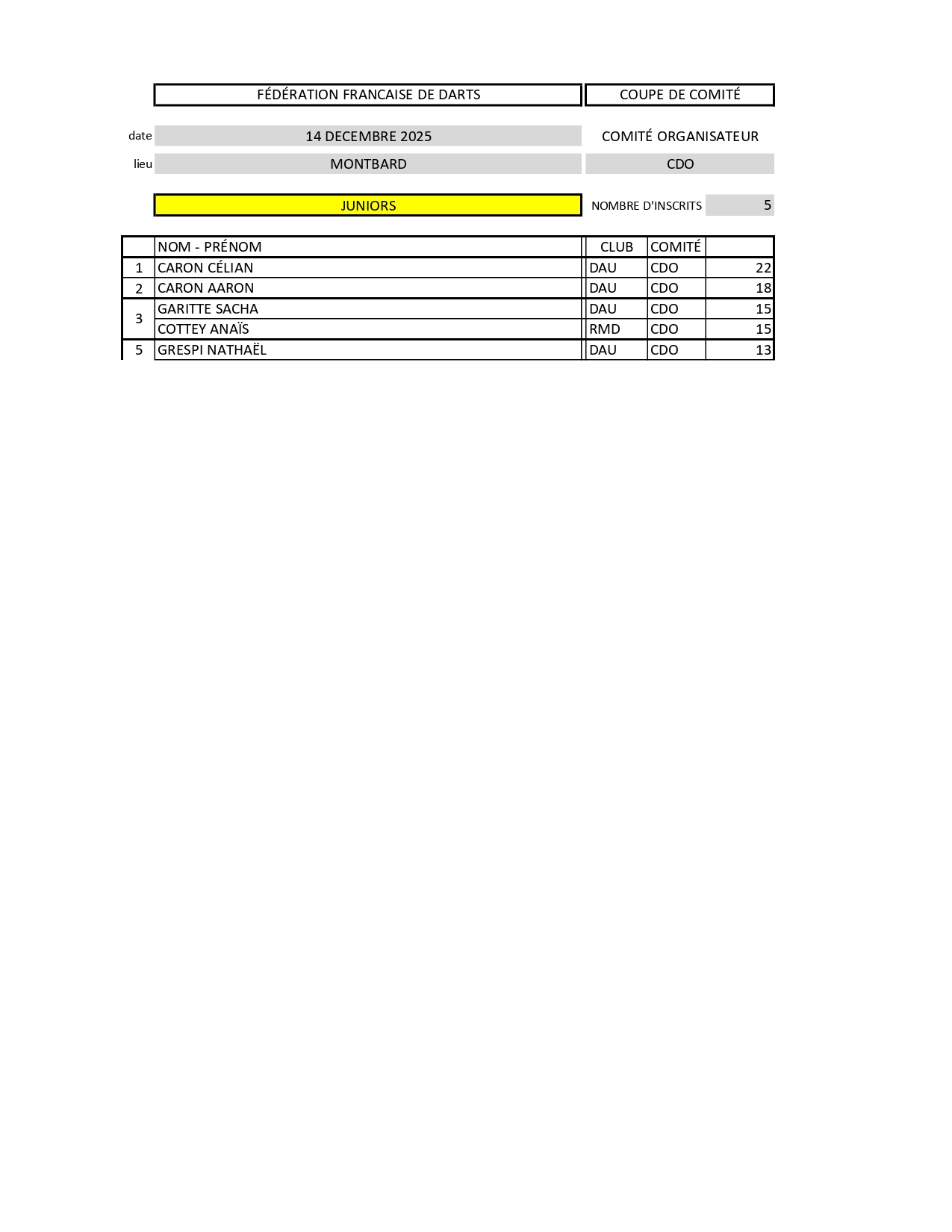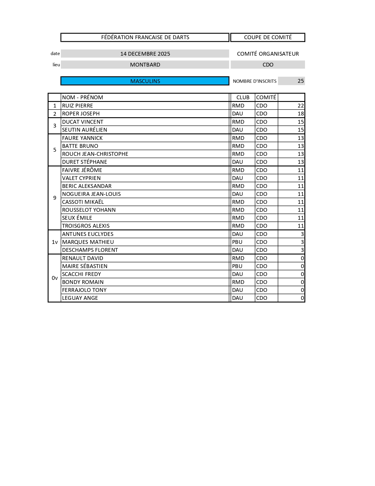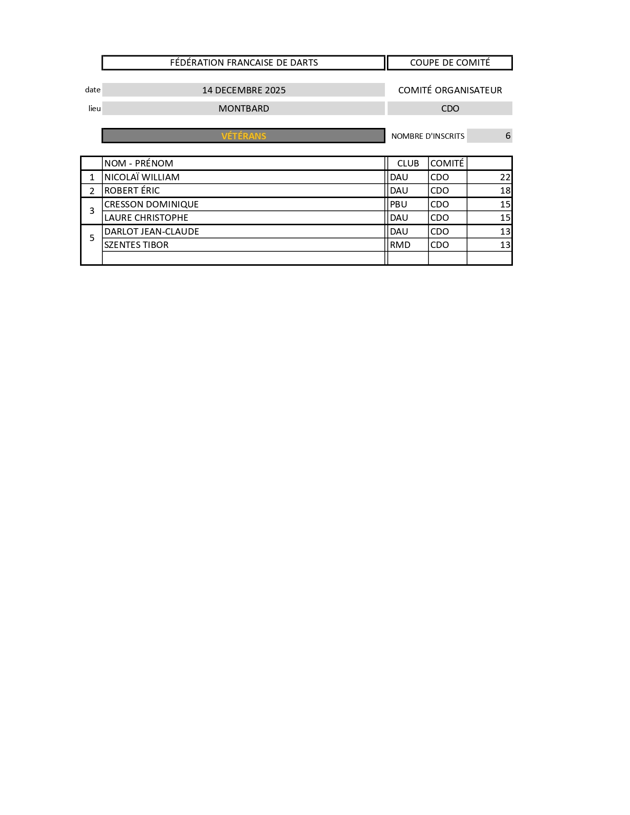RÉSULTATS COUPE DE COMITÉ DE CÔTE D'OR 14-12-2025 MONTBARD